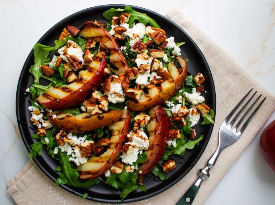 Ensalada tibia de peras grilladas, queso pategrás y nueces